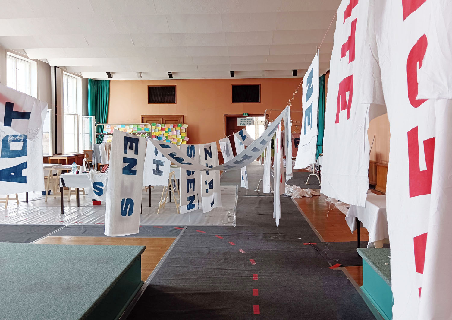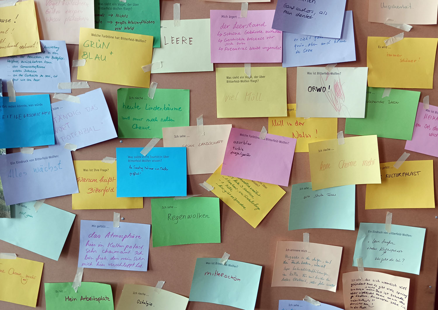Das Projekt basiert auf Empfindungen der Mitwirkenden zu Orten in Bitterfeld-Wolfen: die Goitzsche, die Landschaft rund um den Chemiepark, die Altstadt … Teilnehmer:innen (be)schreiben Beobachtungen, Erinnerungen, Wünsche, Beschwerden und bilden so eine Sammlung von persönlichen Eindrücken und Meinungen. Einige davon werden mit Handsiebdrucktechnik auf Stoffbahnen gedruckt. Ziel ist es, an der Fassade des Kulturpalastes kollektiv einen Satz wachsen zu lassen – eine Ode an und über Bitterfeld-Wolfen. Ein nie fertiger Satz, der ein vielstimmiges Bild von Bitterfeld-Wolfen klingen lässt.