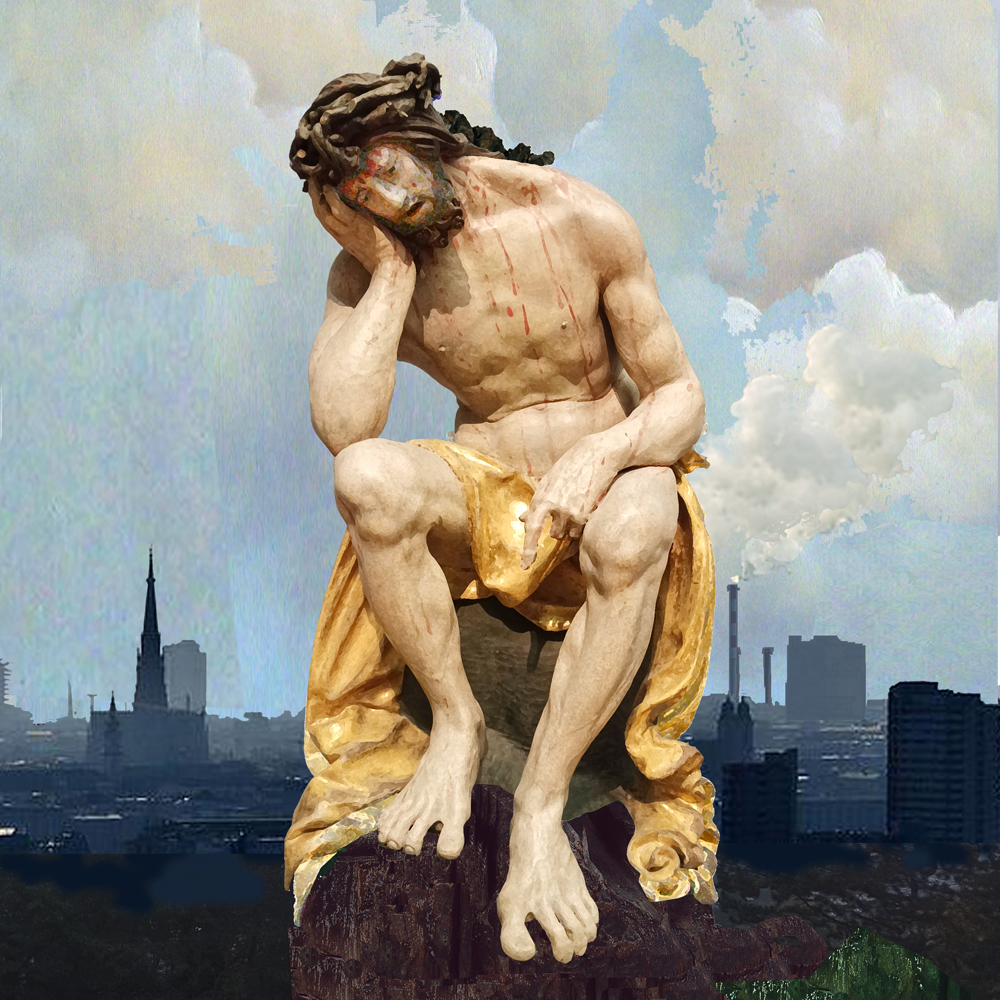Das gestickte Bild basiert auf eine Darstellung des „Christus in der Rast“. Christus – nach der Geißelung und unmittelbar vor der Kreuzigung – sitzt einen Arm auf dem Oberschenkel gestützt und macht dadurch eine Gebärde des Ermattens. Im Hintergrund ist die Stadt Linz als Kulisse zu erkennen.